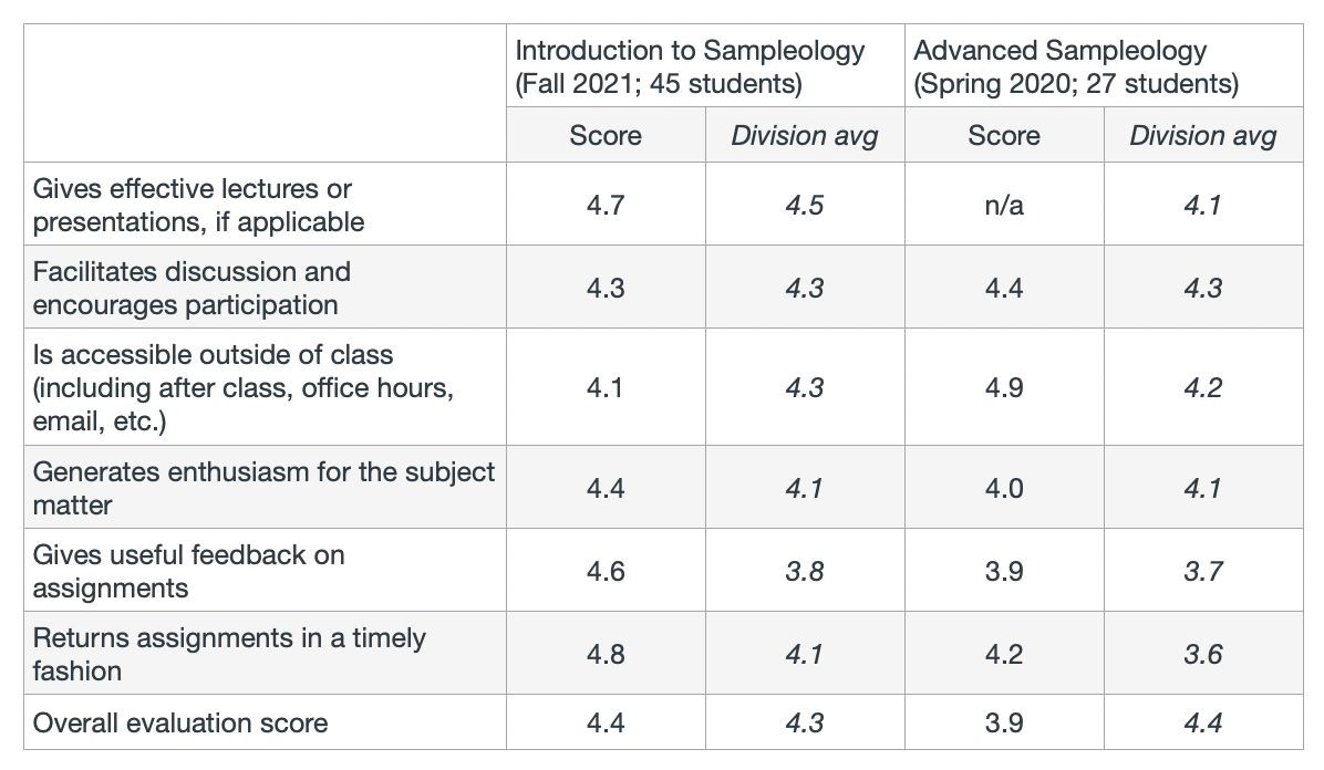 Designed new introductory survey of Sampleology that enrolled 97 first- and second-year students. Authored and delivered 22 interactive lectures, and developed weekly problem sets, midterm exam, and final project for assessment. Supervised a staff of four Teaching Assistants. Received a score of 4.3/5 on student evaluations.
